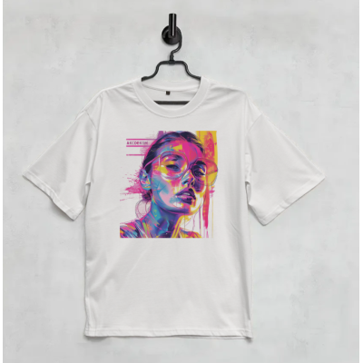 Стильная белая футболка с ярким принтом в стиле нео-арт. Эксклюзивный дизайн от Аксдеком с портретом девушки в неоновых цветах — эффектно, дерзко, уверенно.