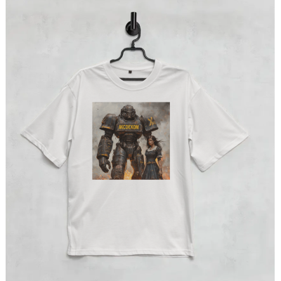 Яркий принт с эффектной парой: девушка и боевой робот в индустриальном стиле. На бронированной груди машины — узнаваемая надпись AKCDEKOM. Футболка сочетает силу, защиту и эстетику техно-романтики.