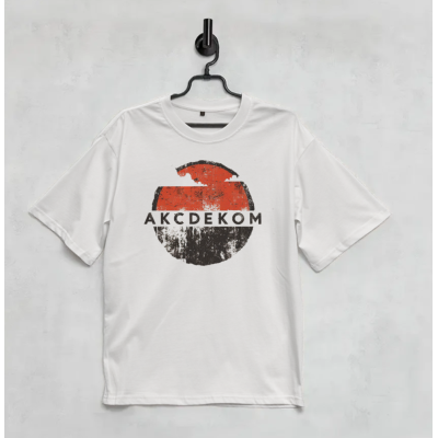 Минималистичный и выразительный дизайн: логотип AKCDEKOM размещён по центру на фоне кругового графического знака в индустриальных цветах — чёрном и ржаво-красном. Эффект потёртости придаёт принту винтажную эстетичность, подчёркивая характер и дух промышленного наследия.