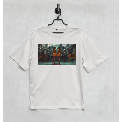 На принте — эффектная сцена с двумя девушками в оранжевых платьях на фоне массивного промышленного оборудования. Изображение воплощает баланс между индустриальной мощью и эстетикой формы.