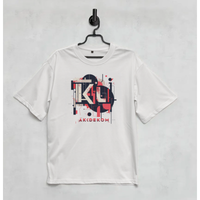 Графический принт с доминирующими элементами и фирменной подписью AKCDEKOM — это сочетание конструктивной строгости и уличного искусства. Акценты красного и тёмно-синего создают технологичный, урбанистический стиль.