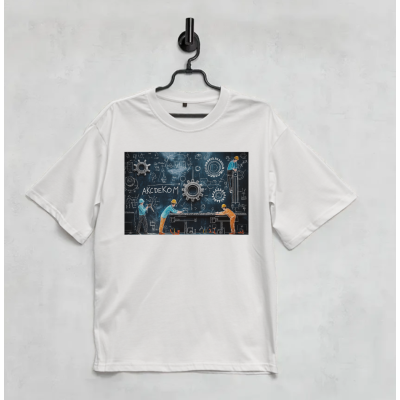 Футболка с ярким и запоминающимся принтом: команда инженеров в процессе сборки сложного механизма на фоне чертежной доски с логотипом AKCDEKOM. Графика выполнена в стилистике техно-граффити, подчёркивая синтез инженерного мастерства и креатива.