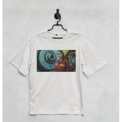 • Принт: портрет девушки в красной спецодежде на фоне промышленного механизма