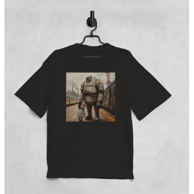 Атмосферный принт в духе стимпанка и ретрофутуризма: девочка дарит цветы массивному роботу. На корпусе робота — логотип AKCDEKOM, символизирующий прочность, защиту и надёжность. Тёплая и трогательная сцена придаёт изделию глубокий эмоциональный подтекст и оригинальность.