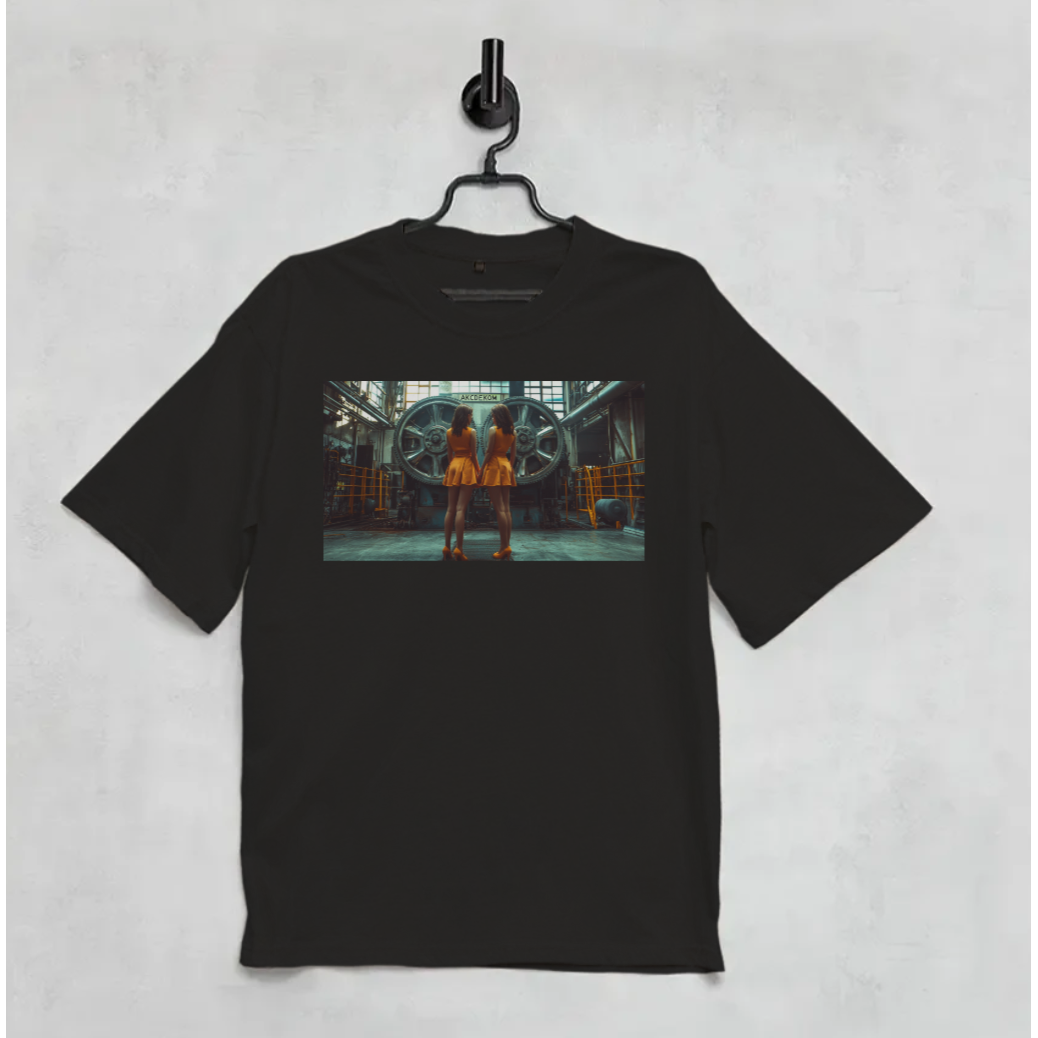 Эффектный индустриальный арт: две девушки в оранжевых платьях и на каблуках стоят перед массивным промышленным оборудованием с логотипом AKCDEKOM. Стильный контраст женственности и мощной механики передаёт философию бренда — соединение силы и эстетики.