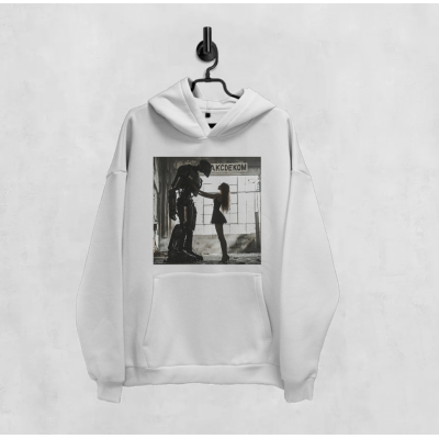 Эмоциональное и атмосферное худи с фотопринтом на грани фантастики и урбан-драмы. На изображении — девушка и боевой робот, столкнувшиеся в заброшенном промышленном пространстве. Контраст механики и человечности, нежности и мощи создаёт сильный визуальный посыл.