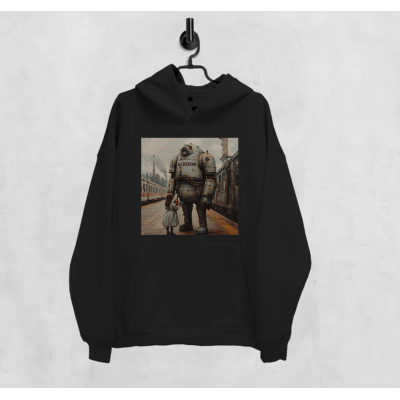 Атмосферное худи с глубоким сюжетом на принте. На изображении — массивный ретро-робот с девочкой на фоне перрона. Контраст индустриальной грубости и детской чистоты создаёт трогательную и философскую сцену, наполненную смыслом и теплом.