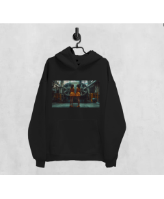 Чёрное худи оверсайз АКСДЕКОМ модель №27 Атмосферная индустриальная сцена с двумя девушками в жёлтых образах, стоящими спиной перед массивным промышленным оборудованием, — мощная визуальная метафора взаимодействия человека и техники. Изделие выполнено в классическом чёрном цвете, с мягким...