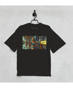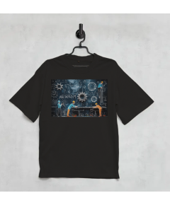 Футболка чёрная оверсайз АКСДЕКОМ модель №73 Футболка с насыщенным принтом на тему инженерии и промышленного прогресса. Силуэты рабочих, чертежи, механизмы и крупные шестерни на фоне доски с надписью "AKCDEKOM" подчёркивают технологичность, труд и креативный подход к производству. Гармония...