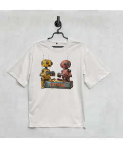 Футболка белая оверсайз АКСДЕКОМ модель №83 Два милых ретро-робота с джойстиками, играющие в видеоигры. Ироничный и доброжелательный дизайн. Характеристики: Материал: 100% хлопок Цвет: белый Крой: оверсайз, унисекс Принт: два робота с геймпадами Размеры: S, M, L, XL, XXL...