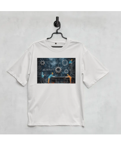 Футболка белая оверсайз АКСДЕКОМ модель №91 Футболка с ярким и запоминающимся принтом: команда инженеров в процессе сборки сложного механизма на фоне чертежной доски с логотипом AKCDEKOM. Графика выполнена в стилистике техно-граффити, подчёркивая синтез инженерного мастерства и креатива....