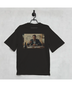Футболка чёрная оверсайз АКСДЕКОМ модель №89 Футболка с брутальным и харизматичным принтом: мужчина в деловом костюме за инженерным чертежным столом держит бокал, позади — техническая документация, элементы машиностроения. Образ уверенного, решительного лидера, сочетающего стиль и интеллект....