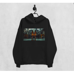 Чёрное худи оверсайз АКСДЕКОМ модель №27 Атмосферная индустриальная сцена с двумя девушками в жёлтых образах, стоящими спиной перед массивным промышленным оборудованием, — мощная визуальная метафора взаимодействия человека и техники. Изделие выполнено в классическом чёрном цвете, с мягким...