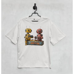 Футболка белая оверсайз АКСДЕКОМ модель №83 Два милых ретро-робота с джойстиками, играющие в видеоигры. Ироничный и доброжелательный дизайн. Характеристики: Материал: 100% хлопок Цвет: белый Крой: оверсайз, унисекс Принт: два робота с геймпадами Размеры: S, M, L, XL, XXL...
